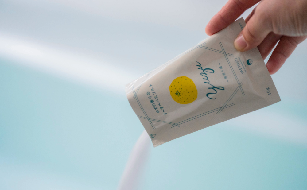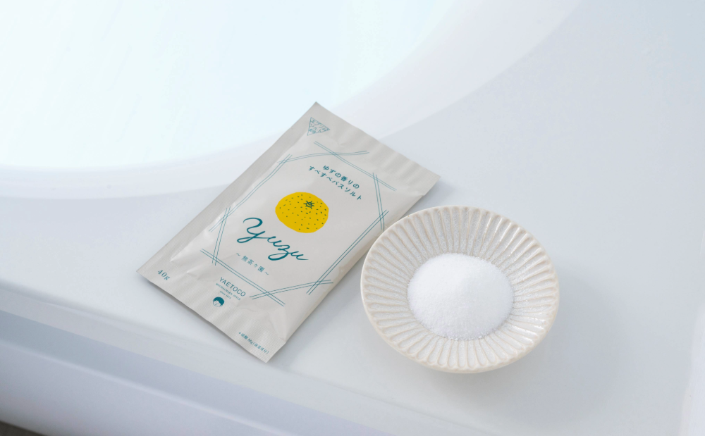無茶々園の生産者が育てたゆずの果皮から抽出した精油(※)を使用した、天然由来のバスソルト。果汁を搾った後の果皮を蒸留して抽出した精油を香りづけに使い、「畑でできたものを余すことなく」をコンセプトのもとに生まれました。